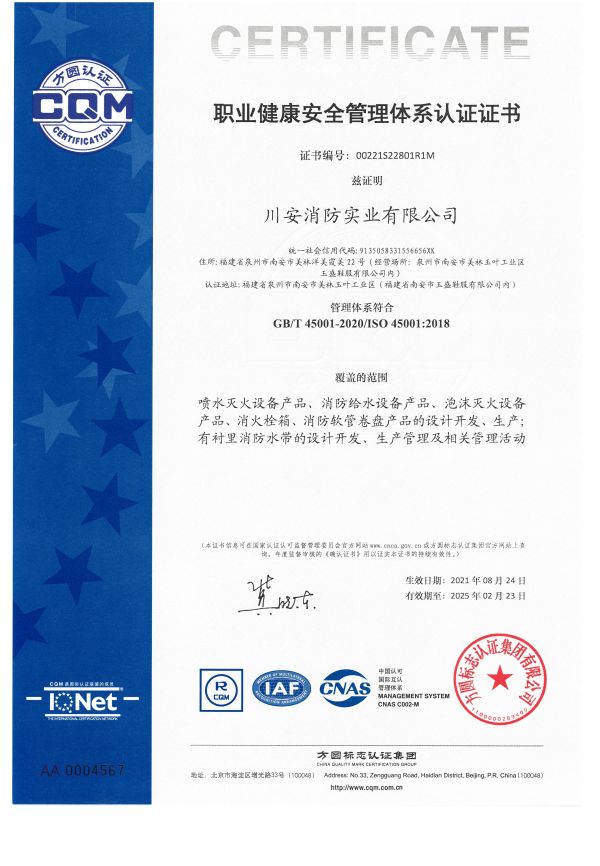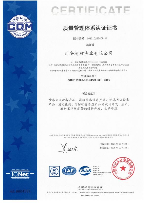 川安消防產(chǎn)品有預(yù)作用裝置、濕式報(bào)警閥、雨淋報(bào)警閥、活塞式雨淋報(bào)警閥、干式報(bào)警閥、減壓閥、泄壓閥、末端試水裝置、智能末端試水裝置、水流指示器、灑水噴頭、干式灑水噴頭、雨淋噴頭、特殊應(yīng)用噴頭、易熔合金灑水噴頭、齊平式灑水噴頭、早期抑制快速響應(yīng)(ESFR)噴頭、擴(kuò)大覆蓋面積灑水噴頭、水霧噴頭、水幕噴頭、泡沫噴頭、室內(nèi)消火栓、室外消火栓、智能消火栓、消防水泵接合器、消防水槍、消防接口、 不銹鋼內(nèi)扣式接扣、壓力開關(guān)、消防信號(hào)閘閥、消防信號(hào)蝶閥、消防閘閥、消防蝶閥、消防軟管卷盤、有襯里消防水帶、固定式消防炮、消火栓箱、防爆壓力開關(guān)、防爆電磁閥、防爆消防信號(hào)蝶閥、卷簾式水帶箱、壓力式比例混合裝置、半固定式(輕便式)泡沫滅火裝置、閉式泡沫-水噴淋系統(tǒng)、低倍數(shù)空氣泡沫產(chǎn)生器、泡沫槍、泡沫消火栓、泡沫消火栓箱、泡沫滅火劑、水系滅火劑、滅火器(干粉、水基、二氧化碳)、七氟丙烷(單柜、雙柜、4.2內(nèi)貯壓式、5.6內(nèi)貯壓式、4.2外貯壓式、5.6外貯壓式)、懸掛式七氟丙烷等500多種,產(chǎn)品均經(jīng)國(guó)家檢測(cè)中心檢測(cè)合格并取得公安部消防產(chǎn)品型式認(rèn)可和自愿性認(rèn)證證書。產(chǎn)品廣泛應(yīng)用于眾多國(guó)家級(jí)重點(diǎn)工程,大型公眾場(chǎng)所和專業(yè)市場(chǎng)等,深受客戶認(rèn)可與好評(píng)。